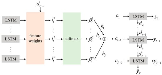Module 3: Time series capture. This module is used to adaptively select the relevant encoder hidden states at all time steps. Specifically, each attention weight of the hidden state in the encoder at the time step is computed based on the previous decoder’s hidden state and the LSTM neuron state. The flow structure of this module is shown in Figure 5.