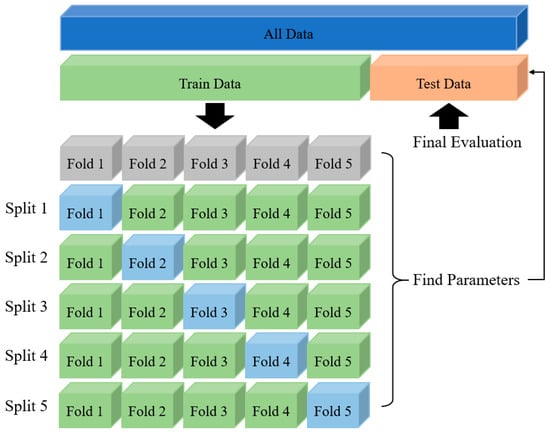 In order to further reduce the model training error caused by the sample data slicing, we trained the model in this paper by combining k-fold cross-validation with predictive modeling. K-fold cross-validation is a technique commonly used to evaluate the performance of machine learning models, which helps us more accurately estimate the performance of the model on unseen data [35]. Using this method, the dataset is divided into k subsets, one of which is kept for validating the model, while the remaining k−1 subsets are used for training the model. This process is repeated k times, each time choosing a different validation subset, and eventually, the average of the k performance evaluation results is obtained. This method allows for a more accurate assessment of the predictive ability and reduces the risk of overfitting while also maximizing data utilization. Considering the length of data taken in this paper, training requirements, and literature references, k = 5 is determined to be applied for predictive model training. K-fold cross-validation (k = 5) is schematically shown in Figure 6.