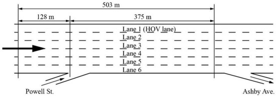The data selected for this study are extracted from video images of northbound traffic on I-80 in Emeryville, California, published in FHWA’s Next Generation Simulation (NGSIM) program, and the layout of the study site is shown in Figure 7 below [37]. This dataset records vehicle location information every 0.1 s from 4:00 p.m. to 4:15 p.m. on 13 April 2005. Among them, Lane 1 on I-80 is a high occupancy vehicle lane (HOV lane), and Lane 6 is an acceleration lane and connects with the entrance and exit gates, considering that the driving behaviors of these two special lanes will be different from the other normal driving lanes. Therefore, this paper only analyzed the vehicle driving data of the remaining four lanes. And the whole experiment distance is 503 m.