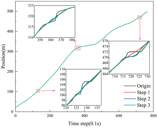 In the NGSIM dataset, the position information of the vehicle itself has a large noise due to the environment, acquisition technology, and other reasons, coupled with the velocity and acceleration information of the vehicle that is obtained by numerical differentiation [38], which will inevitably exacerbate the error of the vehicle data and affect the accuracy of the subsequent researches. Therefore, combining the existing research results and the characteristics of the data required for this article, this paper adopted a three-step method for noise reduction of the original vehicle position information, specifically including determining the location of the outliers, interpolation, and noise reduction in three steps, involving the methods of Gaussian kernel locally weighted regression, Lagrangian interpolation, wavelet noise reduction, and Butterworth noise reduction. Applying the above methods to the dataset for noise reduction, the results are shown in Figure 8, taking 1882 numbered vehicles on Lane 2 of the I-80 region in NGSIM as an example. The figure shows that after the noise reduction processing by the three-step method, the vehicle position curve will be smoother over time, especially at the position mutation, for example, the 120–135, 350–380, and 710–730 time steps. In this way, the data errors caused by the technical problems of the collection equipment, the influence of the external environment, and other conditions can be reduced. Thus, the impact on the subsequent experiments due to data problems can be reduced. At the same time, the smooth position change is also more in line with the behavioral changes of the vehicle in the actual car-following driving state.
