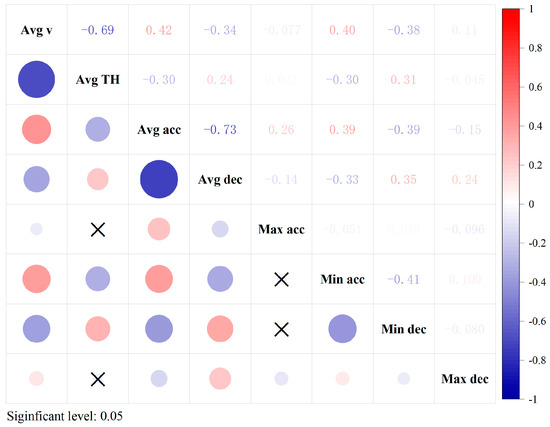 Spearman’s correlation analysis was used to obtain the results of correlation analysis, as shown in Figure 9. The correlation significant rating is 0.05, which means if the absolute value of the correlation coefficient between the factors is lower than 0.05, then these two factors are not significantly correlated. In order to distinguish the driver types more significantly, it is necessary to select the influential factors with small correlations as the basis for clustering. By analyzing the pairs of influencing factors with no significant correlation marked (×) in the figure and combining them with the existing studies [23] and the actual driving situation, this paper selected Avg TH, Max acc, and Max dec as the discriminative basis for the subsequent driver categorization.