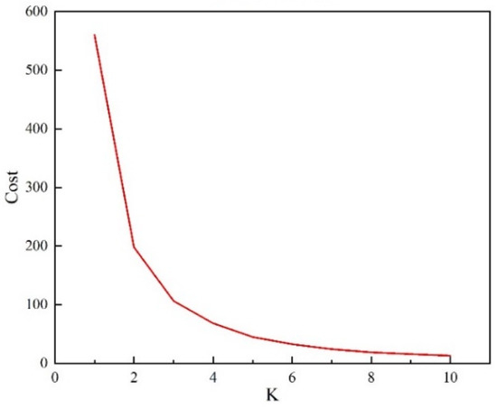 In this paper, the elbow method was used to determine the optimal number of classifications. The cost values of the function corresponding to values of the number of classifications from 1 to 10 are listed in Figure 10. The core idea of the elbow method is that the larger the number of classifications k is, the finer the sample division will be, and the degree of aggregation of each class will gradually increase; then, the error sum of squares will naturally become gradually smaller. However, if the k value keeps rising, the intraclass error variation is already small enough that it can no longer distinguish the samples better than the current k value, meaning the image’s inflection point should be selected. It can be noticed that the degree of distortion is greatly improved when the degree of change in the cost values is gradually insignificant as the values continue to increase. Therefore, for this dataset, k = 3 is the optimal number for clustering. Combining the research object and existing research results, this paper defined three types of drivers: aggressive, neutral, and timid.