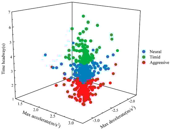 The driver classification graph obtained using the K-means clustering method is shown in Figure 11. It can be found that different types of drivers show different driving characteristics. Among them, aggressive drivers (red dots) have the shortest average headway (hourly distance), and aggressive drivers are generally confident; they pursue higher speeds to pass quickly and keep a shorter distance from the vehicle in front of them. In terms of acceleration and deceleration, since this paper conducts a study of driver heterogeneity under the premise of following, in order to ensure the reasonableness of the driving data in the car, the acceleration range of the vehicle is limited to when screening the data. As a result, the maximum acceleration and deceleration of all drivers presented in Figure 11 are closely clustered in and . Although the numerical range restriction makes the categorization results not differ much in terms of maximum acceleration and deceleration, it is still evident that maximum acceleration and deceleration are overall greater for the aggressive drivers.