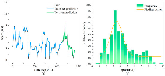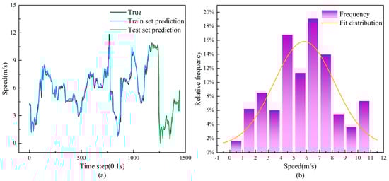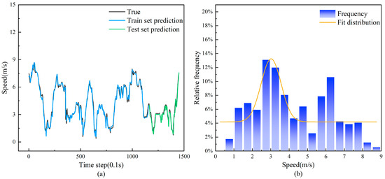 For different types of drivers, the model prediction results are shown in Figure 12a, Figure 13a, and Figure 14a, corresponding to aggressive, timid, and neutral drivers, respectively. In order to facilitate the evaluation of the prediction effect for each type of driver, the evaluation indexes of the prediction results for different driver test sets are given in Table 6. In addition, in order to further analyze the possible reasons for the corresponding prediction effects, Figure 12b, Figure 13b, and Figure 14b partly show the distribution of speeds during the driving process of the three types of drivers and the fitted curves of the corresponding distributions.