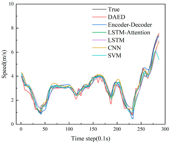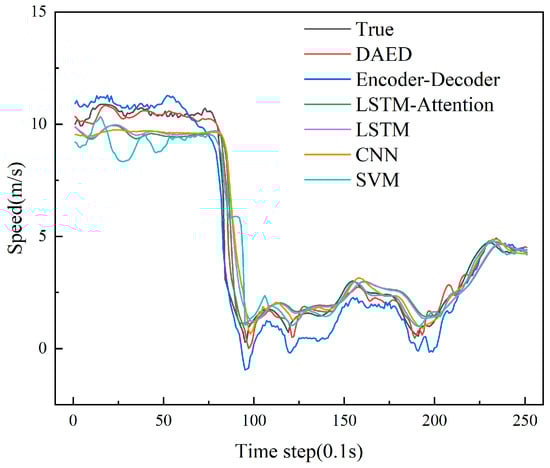 It can be found that the proposed model DEAD has the best prediction effects from a general point of view. Specifically speaking, DEAD has the highest fitting degree at 0.89 R2 and the lowest prediction error at 0.53 MAPE, 0.30 MAE, and 12.40 MAPE in aggressive-type drivers. As for timid- and neutral-type drivers, the encoder–decoder model may have better performance in some time, but the DEAD model is still at a more stable prediction level.
