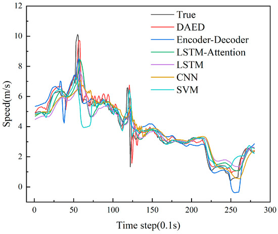 - Two attention mechanisms are used in an encoder–decoder framework to predict vehicle speed. Meanwhile, besides speed, other three-vehicle traveling data are also input to the prediction model, which can further improve the prediction accuracy;