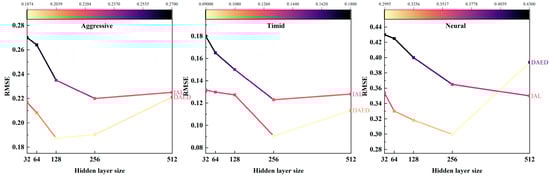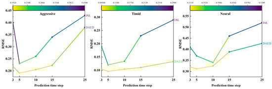 In order to investigate the effectiveness of the temporal attention mechanism in DAED, DAED is compared with IAL (input attention LSTM) when the time step T varies from 3 to 5, 10, 15, and 25. The results of the RMSE for the three types of drivers at different time steps are shown in Figure 18. It can be found that DAED predicts significantly better than IAL when T is relatively large, which suggests that the temporal attention mechanism can capture long-term dependencies by selecting relevant encoder hidden states at all-time steps.