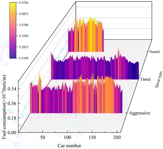 The descriptive statistics of fuel consumption of different drivers are given in Table 9. It can be seen that the mean value of fuel consumption of timid drivers is relatively high. The minimum and maximum values of fuel consumption of this type of driver are the largest among the three types of values. At the same time, its variance is the smallest among the three types, which indicates that the fuel consumption of this type of driver stays at a high level stably. This may be related to the fact that this type of driver is more likely to be affected by changes in external traffic conditions and is prone to frequent acceleration and deceleration during driving. The neutral drivers have the lowest fuel consumption, which may be due to the fact that this type of driver does not have any special driving preferences and will mainly drive according to their driving rhythm with fewer sudden changes. On the other hand, aggressive drivers generally maintain higher driving speeds and smaller headway, so their changes in speed and acceleration are easily affected by the driving conditions of the vehicle in front of them, and their changes in fuel consumption are also more uncertain.