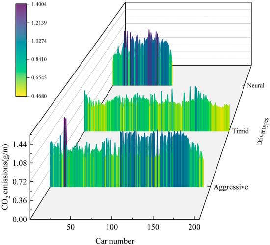 Based on the VT-Micro model and the categorized data of driver heterogeneity, the values of fuel consumption, CO2, and NOx emissions were calculated. From the results, it can be seen that the stratification of different types of drivers is more obvious and that the three types of drivers have the same order of hierarchical distribution in the three studies; in numerical order from the highest to the lowest, it is timid drivers, aggressive drivers, and neutral drivers.