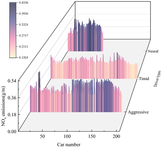 First, unlike CO2, it can be seen from the tables that NOx emissions during vehicle driving are much smaller than CO2 emissions. Secondly, it can still be found that the distribution of emissions for each type of driver is similar to that of CO2 emissions and fuel consumption above. The mean value of NOx emissions of timid drivers is the largest at 322.1 g/km, followed by aggressive drivers at 274.6 g/km and neutral drivers at 215.3 g/km. The emission maximum, mean, and variance of neutral drivers are still the smallest among the three types of drivers, indicating that the NOx emissions of this type of driver are steadily kept at a low level. The best value of the aggressive driver is not much different from that of the timid driver. However, the mean value of the emissions can still be significantly smaller than that of the timid driver due to its smaller variance. Up to this point, it can be found that the three types of drivers have the same distribution order in terms of fuel consumption, CO2 emissions, and NOx emissions.