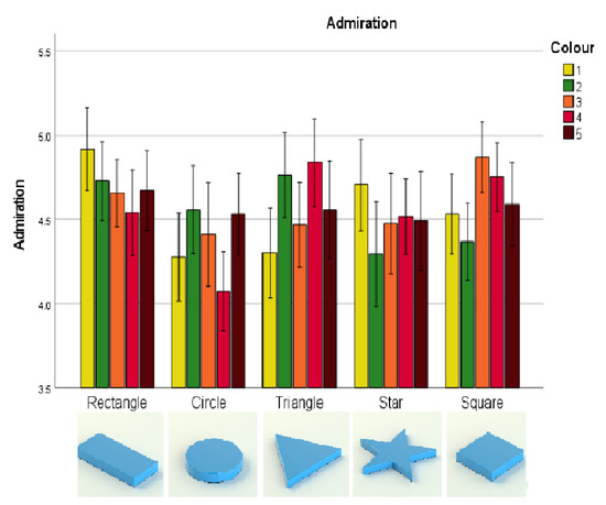 In terms of the interaction between colour and shape, the participants expected there to be more Admiration for the yellow nougat packaging if it were rectangular rather than a circle or a triangle (both ). Furthermore, the participants expected there to be more Admiration for the yellow nougat packaging if it were a star rather than a circle or a triangle (both ). Regarding the colour red, the participants expected there to be less Admiration for the red nougat packaging if it were a circle rather than a triangle, star or rectangle (all .