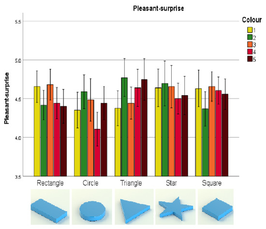 Mean ratings of Pleasant Surprise as a function of colour and shape of the nougat packaging. The error bars represent a 95% confidence interval.