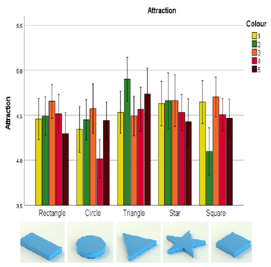 Regarding the interaction between colour and shape, the participants expected there to be less Attraction towards the red nougat packaging if it were a circle rather than a triangle, rectangle, star or square (all ). Furthermore, the participants expected there to be less Attraction towards the green nougat packaging if it were a square rather than a triangle or star (both )