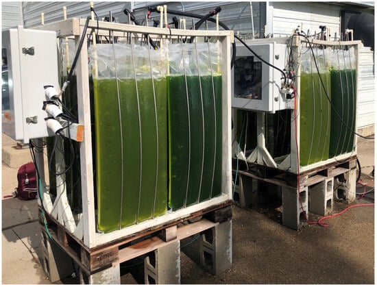The PBRs were set up outside of the dairy barn at the WCROC in Morris, Minnesota. Each of the pallets featured a box on one side, equipped with a system to monitor and control pH and temperature. A liquid CO2 tank served as the carbon source and was used for pH adjustment when necessary. The setup included two bioreactors, each capable of accommodating six hanging bags with a maximum capacity of 80 L each. However, for all experiments, the volume was maintained at 70 L of total volume of the culture mixture. The airflow was measured using an 8360 VelociCalc® Plus from TSI Incorporated (Shoreview, MN, USA), and it was flowing in a rate of 4.61 ± 0.09 m3/min from the blower into the bag through the larger black hose. The air flow system was composed of a neoprene hose (diameter = 0.48 cm) to add carbon dioxide, and a rubber hose (diameter = 3.5 cm) to insert air from the blower into the bag. To not insert 100% CO2 into the system, ideally, the two fluids mixed while entering together with the PVC tube and then flowed into the algal system.