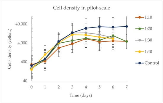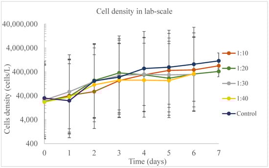 During the lab-scale experiment, cell density was observed to be higher in the control (Figure 2), followed by ratios 1:10 and 1:20. Temperature and day were significant effects (p < 0.05) on the cell density during this experiment. However, in the first six days of the experiment, only the control and ratio 1:40 were significantly different, while on day 7, control and 1:20 were significantly different. Temperature and dilution were not significant (p > 0.05) effects for the samples harvested on day 7. Delgadillo-Mirquez et al. [41] also ran experiments at lab scale (200 mL) with the medium where the microalgae was mixed with bacteria cultures, and the temperature was a significant effect on cell growth, as found in the present study. However, the authors also found that the temperature influenced the biomass productivity, phosphate removal, and ammonium removal, which was not found in the models of this study at lab scale.