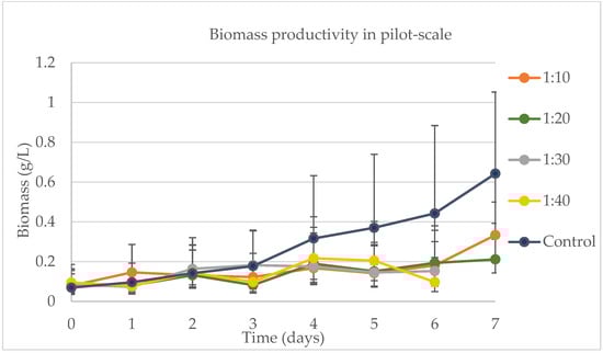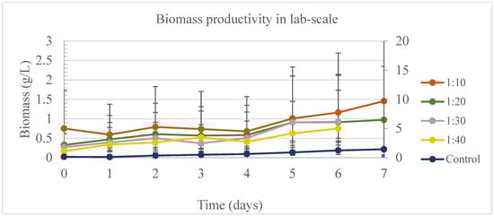 Biomass productivity per day of experiment at lab scale to find the best ratio of DW in water. Primary vertical axis (on the left) is correspondent to the results for samples 1:10, 1:20, 1:30, and 1:40. Secondary vertical axis (on the right) is correspondent to the results for the control.