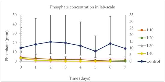 Daily phosphate concentration for the lab-scale experiment during the different ratios of DW in water experiments. The primary vertical axis (on the left) is correspondent to the results for the samples 1:10, 1:20, 1:30, and 1:40. The secondary vertical axis (on the right) is correspondent to the results for the control.
