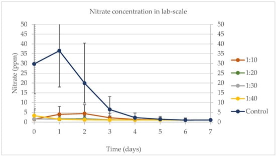Nitrate concentration for the lab-scale experiment when evaluating the better sample of DW in water. The primary vertical axis (on the left) is correspondent to the results for samples 1:10, 1:20, 1:30, and 1:40. The secondary vertical axis (on the right) is correspondent to the results for the control.