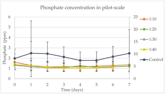 Daily phosphate concentration at the pilot scale for the different experiments. The primary vertical axis (on the left) is correspondent to the results for 1:10, 1:20, 1:30, and 1:40. The secondary vertical axis (on the right) is correspondent to the results for the control.