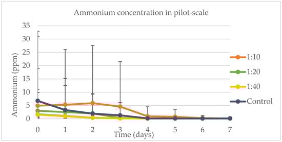 Table 1 shows the removal rates of ammonium for the lab-scale experiment, where 1:10 was significantly different from samples 1:30 and 1:40, on day 0. The samples 1:30 and 1:40 were harvested on day 6 for this experiment, and there was no difference in the ammonium levels between any of the other samples or the control. However, treatments harvested on day 7 were all different from each other. Throughout this experiment, the control removed 99.21% of the ammonium, while samples 1:10 and 1:20 removed 99.53% and 99.37%, respectively (Table 1).