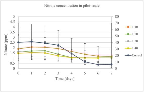 Shows the nitrate concentration for the pilot-scale experiment when evaluating the DW in water. The primary vertical axis (on the left) is correspondent to the results for samples 1:10, 1:20, 1:30, and 1:40. The secondary vertical axis (on the right) is correspondent to the results for the control.