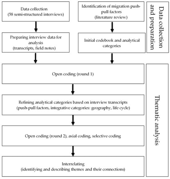 For the qualitative data analysis, field notes and interview transcripts were analyzed using thematic analysis. A three-member research team performed the coding and analysis so that codes and data could be checked and reviewed more efficiently (not depending on the subjectivity of a single individual). The key aspect of the analysis was the definition and identification of micro-level factors influencing the migration decisions of health workers. Our analytical approach was based on the individual’s interpretations, attitudes, and experiences: how interviewees reacted to and evaluated various factors. These subjective interpretations and reactions were considered as micro-level factors. At the beginning of the analysis, a code book and analytical categories were prepared based on the literature, which were supplemented after reviewing the interview transcripts. Thus, the following analytical categories were identified: wealth and income, workplace, human capital, quality of life, family, personal networks, and personality. According to the interviews, geographical factors (e.g., distance, the importance of place) and life cycle/stage of life were also of great importance in the migration decisions of the interviewees. However, since these are integrative categories that cover almost all push–pull factors, we present them in the Discussion section. Segments of the interview texts were classified into these categories, looking for patterns in the interviewees’ narratives. In order to increase the reliability of the analysis, each member of the research team checked the quotes and their categorization. For a quote to be included in the analysis, all members had to agree on the interpretation. It is worth mentioning that the themes were often overlapping; thus, certain interview quotes were associated to multiple themes. During the analysis, we examined how and in what context the abovementioned topics were mentioned by the interview partners. If a certain theme was mentioned, what kinds of attitudes can be identified? How did the identified factor influence the migration-related attitudes and decisions of the interview partner? The process of the data collection, preparation, and analysis is summarized in Figure 1.