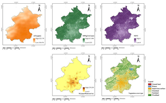 The carbon dioxide concentration data used in the study were obtained from the OCO-2_L2_Lite_SIF 10 r dataset provided by the EARTHDATA platform. After filtering the raw data based on the study area and data quality, the global carbon dioxide concentration data from 1 January 2020 to 31 December 2020 were selected. Subsequently, Python 3.7.8 software was employed to read the daily data, which were then imported into ArcGIS 10.5 for further processing. Monthly and annual CO2 data were calculated, and the data were clipped to the boundary of Beijing city. The final step involved visualization and obtained raster data with a spatial resolution of 880 × 880 m.