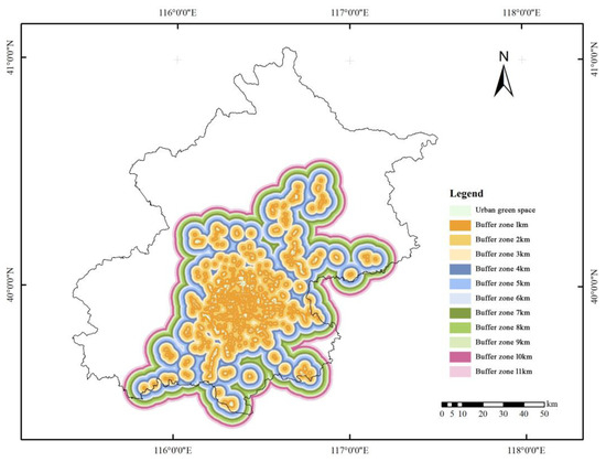 Initially, considering the accuracy of CO2 concentration data and the distribution of urban green spaces, a multi-level buffer analysis is conducted with urban green spaces as the center. The buffer zones start from the spatial boundaries of the green spaces, with a spacing of 1 km and a total length of 11 km, as illustrated in Figure 4. Average CO2 concentrations within each buffer zone are obtained through zoning statistics and exported to Excel 2019. In the spreadsheet, the difference between the average CO2 concentrations of adjacent buffer zones is calculated. If urban green spaces can reduce the CO2 concentration in the surrounding urban areas, a trend of continuously rising CO2 concentrations with increasing distance from the green spaces should be observed. Once the CO2 concentration reaches the first peak and gradually decreases with distance, it is no longer considered within the range of the carbon sink service provided by urban green spaces. In Excel 2019, the SIGN function is employed to determine the trend of CO2 concentration changes. The IF function is used to identify the first peak in CO2 concentration changes, and the corresponding distance is assigned to the urban green space as its carbon sink service radius.