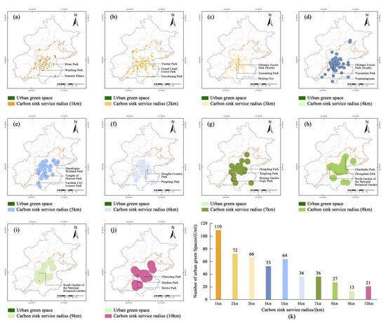 Measurement results of carbon sink service radius of urban green space. (a–j) Spatial distribution of urban green space and carbon sink service radius; (k) statistics of the carbon sink service radius of urban green spaces.