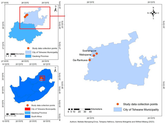 This study was conducted across three communities (Ga-Rankuwa, Mabopane and Soshanguve) in the City of Tshwane Metropolitan Municipality in Gauteng province, South Africa (Figure 1). The selected municipality lies between 25° South and 28° East of Gauteng province, covering 6298 km2 surface area. Incorporating the city of Tshwane, the municipality stands as the capital city of the republic of South Africa and is constantly growing. Gauteng province is the smallest province in South Africa, sharing its boundaries with North West, Free State, Limpopo and Mpumalanga. This province is also highly urbanized. The City of Tshwane municipality is situated north of the province and is one of the single-largest municipality in the country, with approximately 2.9 million inhabitants [23]. This district is situated in the country region that receives summer rainfall, and it is home to the grassland and savanna biome [24]. This region has an average temperature of 29 °C and receives approximately 622 mm of rainfall annually [25,26].