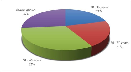 As indicated in Figure 3, participants were divided into four age groups and the majority (32%) of the participants who knew about M. zeyheri fell within the 51–65 age group, followed by those in the 66+ age group. Distinctively, the number of participants knowledgeable about M. zeyheri decreased among the younger participants. These results are similar to a previous study showing that elderly people are more informed about indigenous trees than young people [39]. This also implies that traditional knowledge about M. zeyheri in the City of Tshwane Metropolitan Municipality is facing the risk of being eroded with the passing on of older community members, as some participants have also mentioned. According to Machaba [40], the adoption and utilization of indigenous knowledge and indigenous plants are declining among younger generations, and this could be due to the younger generation’s less interest in inheriting and using traditional knowledge. Additionally, modernization and the advancements in technology and science have now changed the social setup and lifestyle patterns of people [41]. Therefore, young people are abandoning their traditions and cultures.