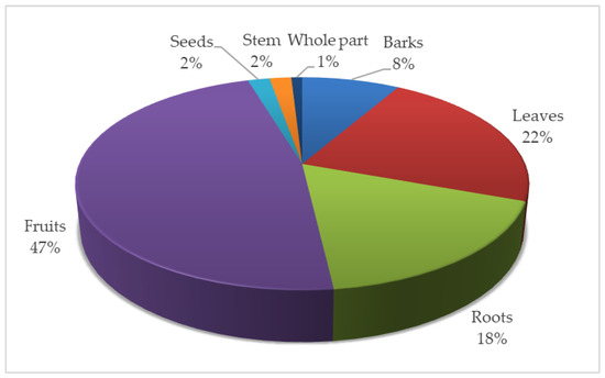 Different parts of M. zeyheri serve different purposes. Among the different parts, fruits (47%) were the most utilized part of the plant, followed by the leaves (22%), roots (18%) and bark (8%). The seeds (2%), stem (2%) and whole plant parts (1%) were less commonly used (Figure 5). These results resonate to those found in other studies in other parts of the world [72,73], which reported the predominant use of fruits. Most fruits are eaten raw after ripening, and others are dried and preserved for later use or to make beverages. In addition to being used as a food plant, M. zeyheri is also used as a medicinal plant for treating some common ailments. In this regard, the leaves were the commonly used part of the plant to treat those ailments. According to Ahmed [74] and Ghasemi, et al. [75], the utilization of leaves in herbal medicine is better for the endurance of medicinal plants compared to the bark and roots, which pose a serious threat to local plants because the excessive utilization of reproductive parts or roots for medicinal purpose can lead to a decline in plant populations [76].