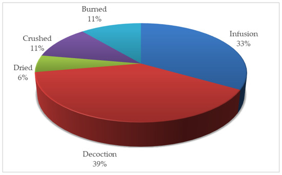 Regarding the preparation method of M. zeyheri, decoctions (39%) and infusions (33%) were the most frequently reported methods that local people used (Figure 6). These results are comparable to what was found in other research [77,78], which revealed decoctions as the most frequently used preparation method. Due to their ease of preparation, decoctions are used as the main method of drug preparation in traditional healing systems [77]. Many indigenous cultures worldwide use them as their primary means of extracting the therapeutic properties of the plant [79,80,81]. Decoctions are prepared by boiling a certain part of the plant until the volume of the water is reduced by half [82]. This allows the thorough extraction of both water- and heat-soluble compounds, maximizing the therapeutic potential of the plant. Boiling the plant material in water also helps eliminate contaminants, making it safer than other preparation methods. Conversely, infusions involve soaking a plant part in hot water for some time, whether overnight or during the day [82].