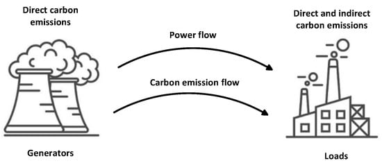 In a straightforward sense, the carbon emission flow in the power system can be likened to affixing a carbon emission label to the current flowing through each branch. There exists an intrinsic relationship between the carbon emission flow and the current flow. Essentially, in the power system, the carbon emission flow initiates from the power plants (generator nodes), accompanies the power injection from these plants into the grid, moves along with the system’s currents within the grid, and ultimately reaches the consumption terminals (load nodes) on the user end. Superficially, carbon emissions may appear to be emitted into the atmosphere from power plants; fundamentally, however, carbon emissions are discharged into the atmosphere via the carbon emission flow originating from electricity users, as shown in Figure 1.