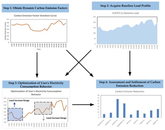 Low-carbon demand response guides electricity users to modify their consumption behavior by providing information on the corresponding carbon emissions generated under different electricity consumption patterns. This, in turn, leads to a reduction in carbon emissions within the power system and promotes the integration of renewable energy sources. The schematic diagram of the decarbonization mechanism for low-carbon demand response is illustrated in Figure 2. In practical operation, the carbon emission reduction achieved through a low-carbon demand response can be quantified through the following steps: