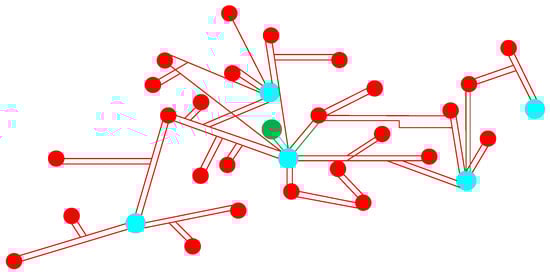 In Fangshan, the primary types of local power sources are waste incineration power and photovoltaic generation, with relatively low installed capacity and output proportions. The total installed capacity is approximately 70,400 kW. This includes four centralized photovoltaic power stations with an installed capacity of around 26,100 kW, residential distributed photovoltaic capacity of about 6500 kW, non-individual distributed photovoltaic capacity of approximately 17,800 kW, and waste-to-energy generation (Dishuiyan Waste Incineration Power Plant) with an installed capacity of roughly 20,000 kW [17]. The topological structure diagram of the Fangshan District power grid is depicted in Figure 3. In the figure, red represents the 110 kV substation and transmission lines, blue represents 220 kV, and green represents 500 kV.