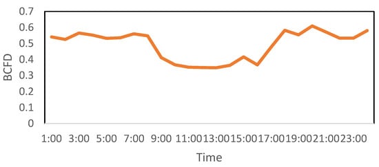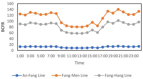 Given that the Fangshan grid is a typical receiving-end grid, with the load mainly supported by external power supply and only a minor contribution from local sources such as Dishuiyan Power Station and some distributed photovoltaics, the overall output proportion is relatively low. Consequently, the carbon emission factors in the Fangshan District are primarily influenced by the carbon emission factors of the external power supply. Figure 4 illustrates the BCFR of the primary external power transmission channels in the Fangshan grid. As all three transmission lines originate from the Hebei power grid, their carbon flow density remains consistent, as depicted by the variation curve in Figure 5.