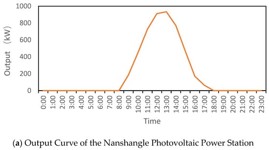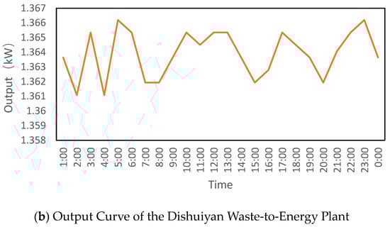 Figure 6a illustrates the output curve of the Nanshangle Photovoltaic Power Station in the Fangshan district, while the output curves for other photovoltaic generation resources within the Fangshan district are coupled proportionally based on their installed capacities. Correspondingly, Figure 6b represents the output curve of the Dishuiyan Waste-to-Energy Plant at the same moment. By analyzing Figure 6, local carbon emissions from power sources in the Fangshan district can be determined. Combining this information with Figure 4 and the load curve of the Fangshan district, the daily variations in carbon emission factors for the Fangshan district are presented in Figure 7.
