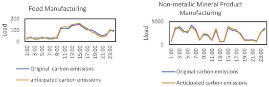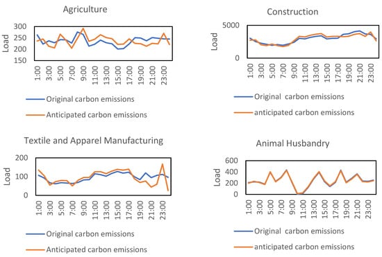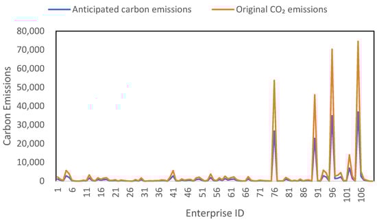 Based on the above data and considering the power generation profiles of various enterprises in Fangshan district, it is possible to calculate the carbon emissions of local businesses within the region. A low-carbon demand response analysis was conducted on 108 users from 6 industries in Beijing’s Fangshan district, including agriculture, animal husbandry, food manufacturing, textile and apparel manufacturing, non-metallic mineral product manufacturing, and construction. The involved enterprises are represented by English abbreviations due to data requirements. The analysis was carried out following a stepwise approach with a factor of 2.3. The carbon emissions of each enterprise and the anticipated carbon emissions after a low-carbon demand response are illustrated in Figure 8.