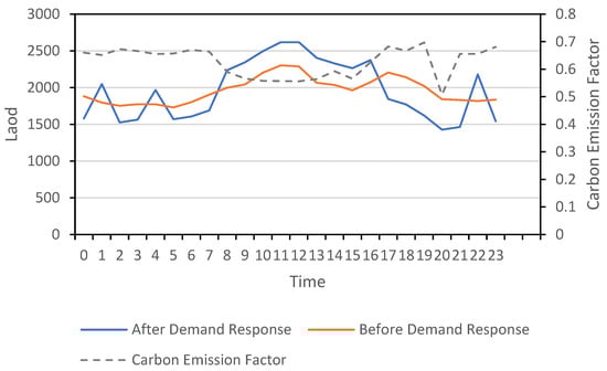 Taking a specific enterprise in Fangshan District as an example, with a maximum load of 2605 kW, it is assumed that 5% of this load can actively participate in a low-carbon demand response. On a typical day, the load variations of the electricity-consuming enterprise before and after engaging in a low-carbon demand response, along with the corresponding carbon emission factors at specific moments, are illustrated in Figure 12. Upon perceiving the disparities in carbon emissions across different time periods, users aim to reduce their overall carbon footprint. Consequently, users endeavor to minimize electricity consumption during high carbon emission factor periods and shift their energy consumption behavior to time slots characterized by lower carbon emission factors.