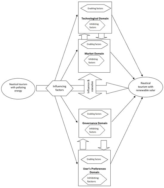 In this study, the transition process from polluting energy to renewable solar energy used for nautical tourism ships is analyzed using the framework provided by the energy transition process from the perspective of the socio-technical approach developed by Loorbach et al. [].