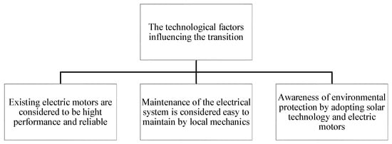 According to the specialized literature and confirmed by the respondents of the study, the first factor that influences the energy transition in the field of technology is one mentioned in the specialized literature [,] that the existing electric motors are still performing and are reliable, with efficient use of energy, and are difficult to damage (Figure 3).