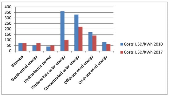 According to Bigerna and Trstenjak et al. [,] and confirmed by the interviewees of the study, a favorable factor is the progressive trend of promoting sustainability in general and the tourism market at the macro level, with the emergence of an awareness among tourists regarding the major impact that tourism has on the environment in the climate context. Survey respondents noted this awareness, but its adoption in sustainable behavior is considered nascent. Also, according to Panprayun & Pitaksintorn [], there is an incipient tendency among tourists to choose ecological friendly equipment and activities, an aspect confirmed by the interviewees of the study. The increased attractiveness of boats with state-of-the-art technology is mentioned by Panprayun & Pitaksintorn [] as a contributing factor and confirmed by interview respondents who appreciate that solar boats are a tourist attraction in themselves. An analysis of the total costs (Figure 4) of renewable energy production shows that substantial progress has been made in the field of solar photovoltaic energy. These costs fell from USD 350/kWh in 2010 to USD 100/kWh in 2017, i.e., by 72%, which is a big boost for the economic aspects of financial policy implementation.