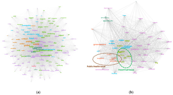 (a) Visualization of the Semantic Network Map of Top Words in ‘Tweets from GPU’; (b) Visualization of the Semantic Network Map of Top Words in ‘Replies Sent to GPU’. (The different colors correspond to the various modularity classes within the semantic network. The size of each term (i.e., node) indicates its comparative frequency within the corpus. The lines connecting the terms represent their co-occurrence (i.e., ties) in specific posts. The thickness (i.e., width) of each line denotes the tie strength (or weight), reflecting the frequency of co-occurrence between the connected terms. The concept of ‘closeness’ between two terms is reflected by their distance, suggesting that a shorter distance between terms indicates they are more frequently used together within the corpus and share similar themes, often belonging to the same cluster [67]. While ‘Tweets from GPU’ represent broad and general keywords such as ‘nature’, ‘world’, ‘planet’, and ‘conservation’, ‘Replies to GPU’ correspond to groups of cohesive keywords relevant to public health issues (e.g., ‘public’, ‘health’, ‘communities’, ‘help’) and fossil fuel issues (e.g., ‘fossil’, ‘oil’, ‘gas’, and ‘industry’).).