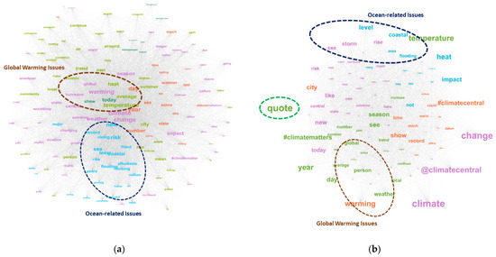 (a) Visualization of the Semantic Network Map of Top Words in ‘Tweets from Climate Central’; (b) Visualization of the Semantic Network Map of Top Words in ‘Replies Sent to Climate Central’. (The different colors correspond to the various modularity classes within the semantic network. The size of each term (i.e., node) indicates its comparative frequency within the corpus. The lines connecting the terms represent their co-occurrence (i.e., ties) in specific posts. The thickness (i.e., width) of each line denotes the tie strength (or weight), reflecting the frequency of co-occurrence between the connected terms. The concept of ‘closeness’ between two terms is reflected by their distance, suggesting that a shorter distance between terms indicates they are more frequently used together within the corpus and share similar themes, often belonging to the same cluster [67]. Both ‘Tweets from Climate Central’ and ‘Replies to Climate Central’ feature keywords relevant to global warming and ocean-related issues, with specific terms such as ‘sea’, ‘level’, and ‘rise’. In the case of ‘Replies to Climate Central’, the term ‘quote’ was frequently used, as indicated by its comparatively large size.).