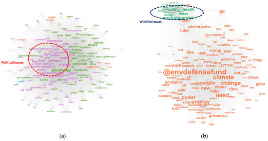 (a) Visualization of the Semantic Network Map of Top Words in ‘Tweets from EDF’; (b) Visualization of the Semantic Network Map of Top Words in ‘Replies Sent to EDF’. (The different colors correspond to the various modularity classes within the semantic network. The size of each term (i.e., node) indicates its comparative frequency within the corpus. The lines connecting the terms represent their co-occurrence (i.e., ties) in specific posts. The thickness (i.e., width) of each line denotes the tie strength (or weight), reflecting the frequency of co-occurrence between the connected terms. The concept of ‘closeness’ between two terms is reflected by their distance, suggesting that a shorter distance between terms indicates they are more frequently used together within the corpus and share similar themes, often belonging to the same cluster [67]. Key differences between the discourses of ‘Tweets from EDF’ and ‘Replies to EDF’ lie in distinct key topics. ‘Tweets from EDF’ address political issues, featuring terms like ‘trump’, ‘biden’, ‘administration’, and ‘president-elect.’ In contrast, ‘Replies to EDF’ focus on wildfire issues, with terms such as ‘forest’, ‘burn’, ‘area’, and ‘damage.’).