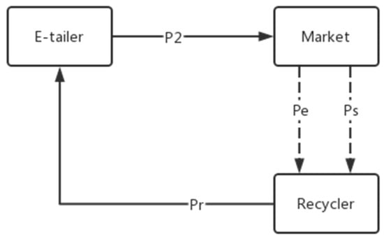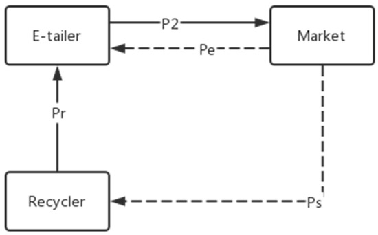 Figure 1 shows the decentralized decision-making on the part of the recycler and the e-tailer, and they each make decisions with the goal of maximizing their respective interests. is regarded as a fixed value. The e-tailer, as the dominant party, first determines sales price , whereas the recycler determines recycling prices and afterwards.