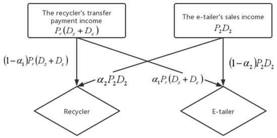 As shown in Figure 3, the incomes of the recycler and the e-tailer come from two sources, which are the transfer payment income of the recycler and the sales income of the e-tailer. Before the revenue-sharing contract, these two parts correspond to the incomes of the recycler and the e-tailer, respectively. After the revenue-sharing contract has been made, the transfer payment income of the recycler is divided into two parts, of which one is for the recycler and the other is for the e-tailer, whose share is determined by the revenue-sharing factor . Similarly, the sales income of the e-tailer is divided into two parts, of which one is for the e-tailer and the other is for the recycler, whose share is determined by . Hence, the incomes of the recycler and the e-tailer are changed by the contract while their costs, as expressed in Equations (7) and (8), respectively, remain the same as before the contract.