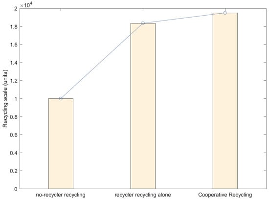 As can be seen in Figure 4, when there is no recycler to carry out recycling of used electronic products, the potential market recycling scale depends entirely on consumer awareness of recycling, i.e., the number of used electronic products that consumers voluntarily recycle for free in order to promote the sustainable development of the reverse supply chain of electronic products. When a third-party recycler carries out recycling alone, on the other hand, the scale of used electronics recycling rises by 83.5%, driven by the recycling price, indicating that the emergence of the role of recyclers can effectively increase the scale of recycling of used electronics and accelerate the reverse flow of the electronics supply chain. When e-tailers cooperate with recyclers for recycling, more people will understand and join the recycling process of used electronic products due to the traffic advantage of e-tailers. Therefore, compared to recyclers recycling used electronic products alone, the cooperation between e-tailers and recyclers recycling electronic products can more effectively increase the scale of recycling used electronic products, and is more able to promote the reverse supply chain of product flow and sustainable development.