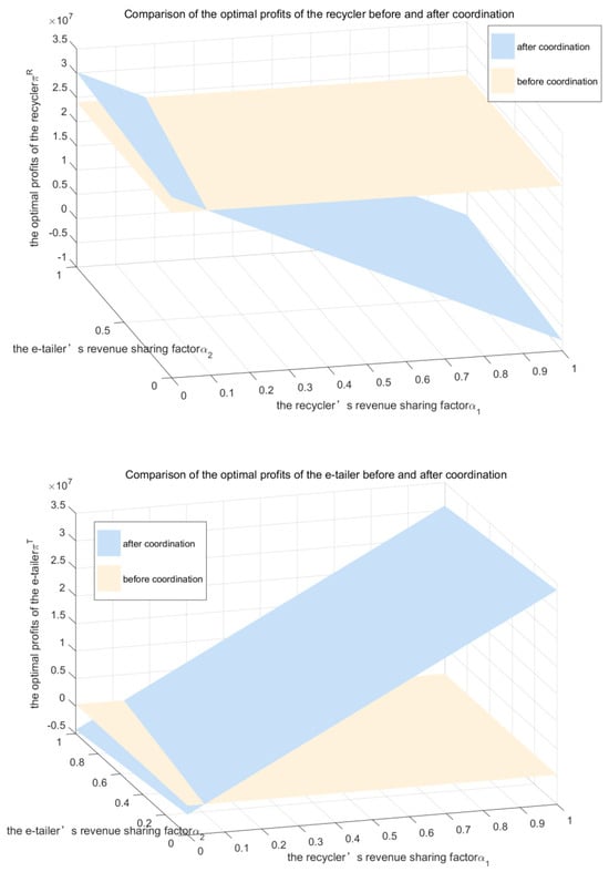 The revenue-sharing factor is divided into two parts, which are the recycler’s revenue-sharing factor and the e-tailer’s revenue-sharing factor . As the values of the two factors differ, the profits of the recycler and the e-tailer differ as well. The values of the other parameters are those given at the beginning of this chapter. Random values are assigned to and within the range of to simulate the profits of the recycler and the e-tailer under different contracts, which are then compared to the profits in the non-cooperative scenario in order to explore the critical points of cooperation between the two parties. The results are shown in Figure 5.